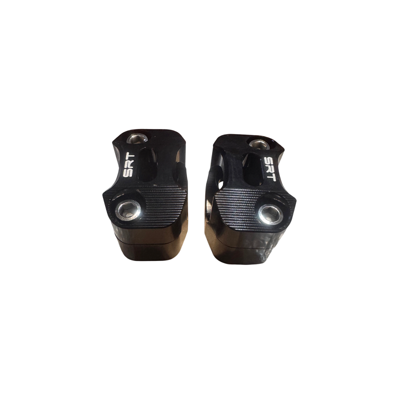 I nostri riser manubrio SRT sono universali con un sistema di asole che permette di montarli su ogni interasse fori possibile, venduti solamente a coppia, all'interno del kit forniamo 2 viti in inox per fissarli agli attachi presenti di serie, più 2 viti in inox per serrare i riser.